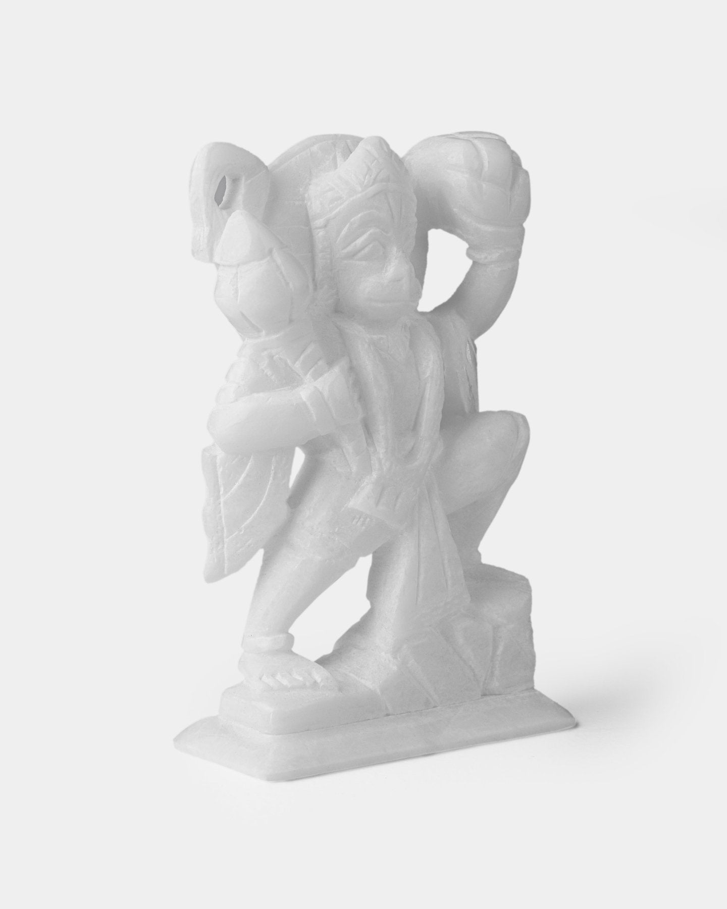The statue is meticulously hand-crafted from high-quality Rajasthani white marble, giving it a beautiful and luxurious appearance. The intricate details depict Hanuman in a powerful pose, holding his Gada (mace), symbolizing his strength and valor. Hanuman's expressive face shows his devotion and loyalty, with his eyes radiating determination and grace. The statue also features Hanuman's tail curling upwards and detailed carvings on his attire, making this statue a true masterpiece.