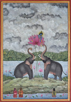 This exquisite painting of Elephants with Lord Krishna in Lotus captures the divine beauty of Lord Krishna surrounded by majestic creatures. Captured with delicate brushstrokes, this piece is sure to bring spiritual vibrancy and memorable artistry to any living space. A unique addition to your home decor, it is a timeless reminder of the artistry and spirituality of Indian culture.