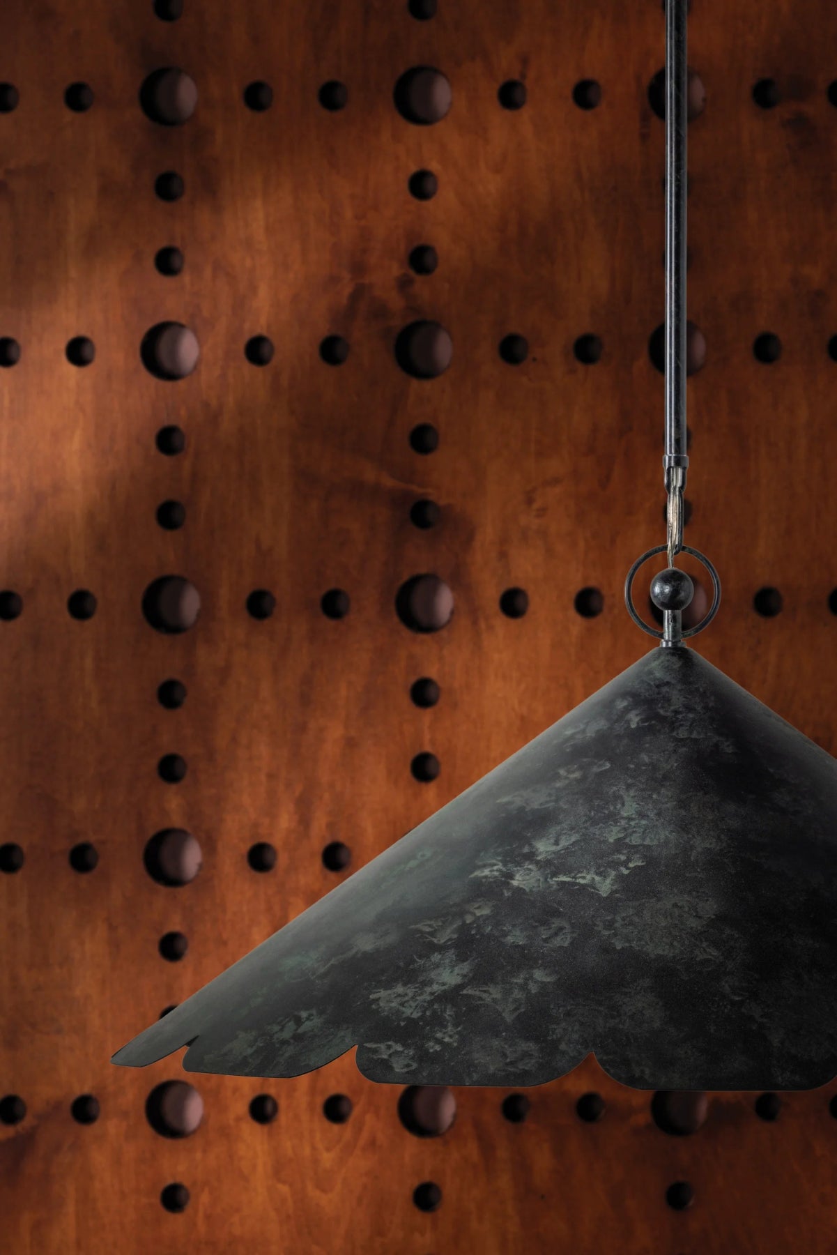 A true artisanal family, Folly Beach is lighthearted, sculptural, and a little unexpected. Inspired by the iconic shape of the Palmetto tree, the shade has a wavy, hand-sketched quality imbued with effortless charm. The rich Verdigris finish over steel brings coastal beauty into any space. Available as a lamp and a pendant in two sizes, Folly Beach adds an undeniable touch of whimsy to a bedside, kitchen, or living room.