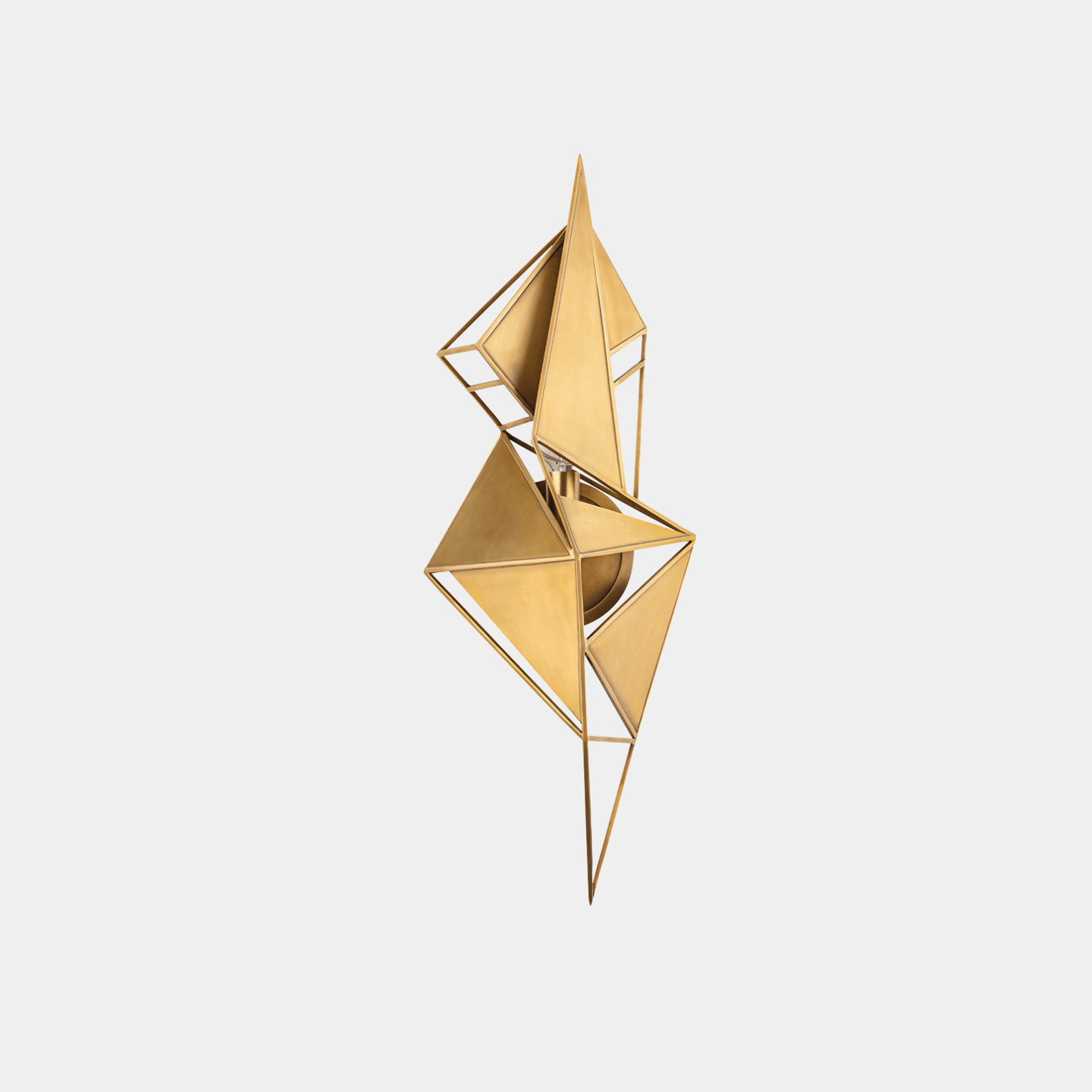A series of abstract, angular shapes come together to create this eye-catching sconce that plays with shape, light and form. Light reflects off the Vintage Brass and flows through the open spaces making gorgeous patterns and shadows.