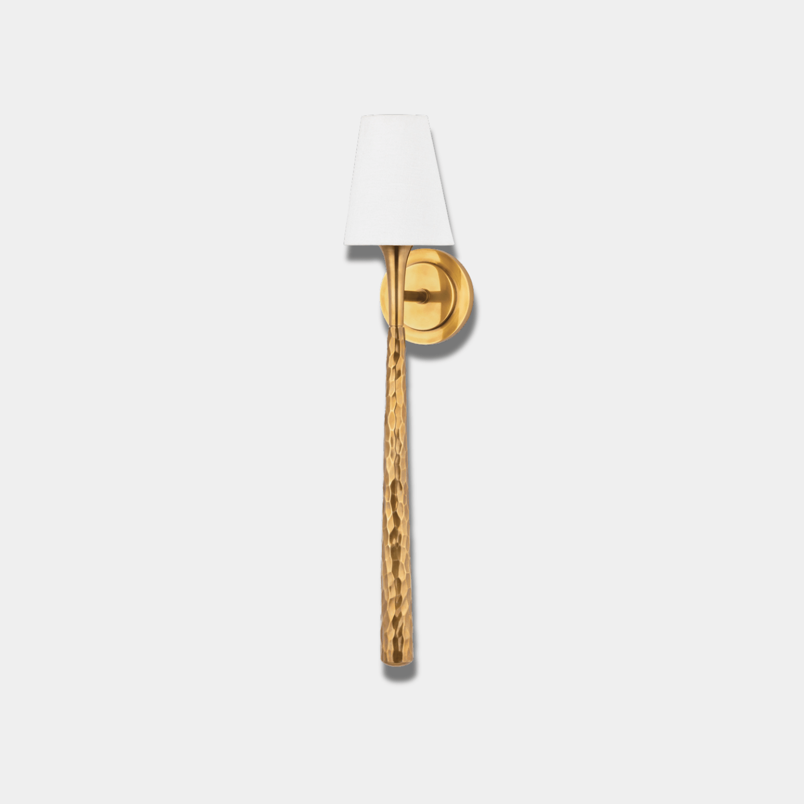 Greta elevates the classic sconce shape with surprising details and unexpected materials. The gorgeously textured vintage brass arm is the centerpiece of this design. Extending out from a small, round backplate, the tapered wand-like arm demands to be touched. A similarly tapered white linen shade fills the space with a clean, crisp light.