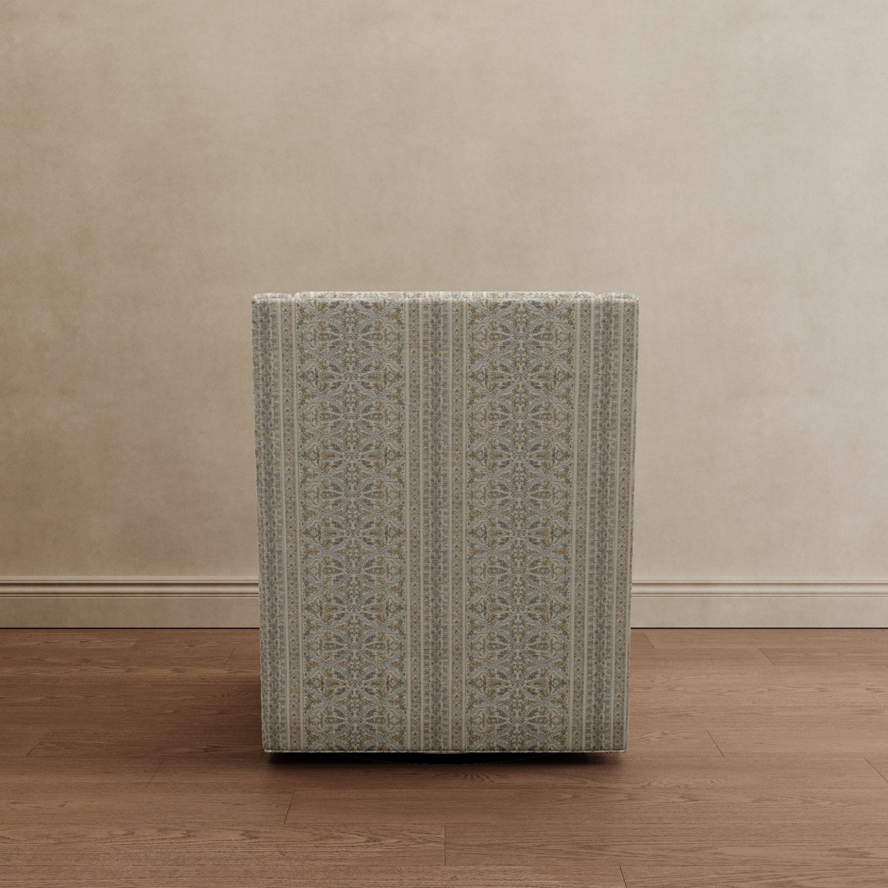 The Lotus Lounger Swivel Chair combines modern comfort with a touch of heritage-inspired elegance. Its dramatic high back beautifully frames intricate fabric applications, while the weltless, sloping arms create graceful, sweeping lines reminiscent of classic handcrafted furniture. Designed for both style and relaxation, this swivel chair invites you to unwind in sophistication. Includes a 12" Lombard Pillow, completing the look with refined comfort and timeless charm.