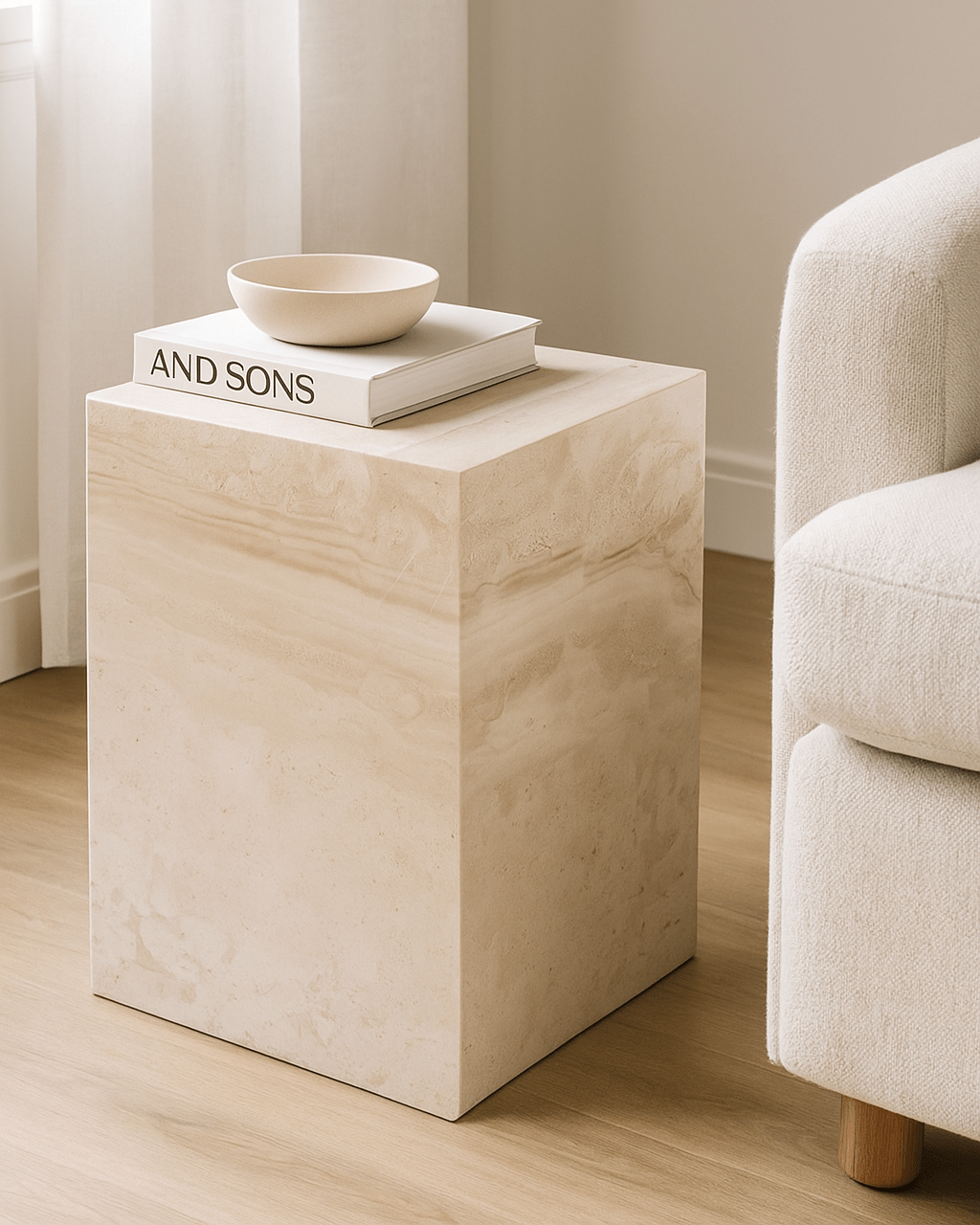 This is our Metier Beige Marble Side Table, Â featuring a seamless marble structure easy to style.