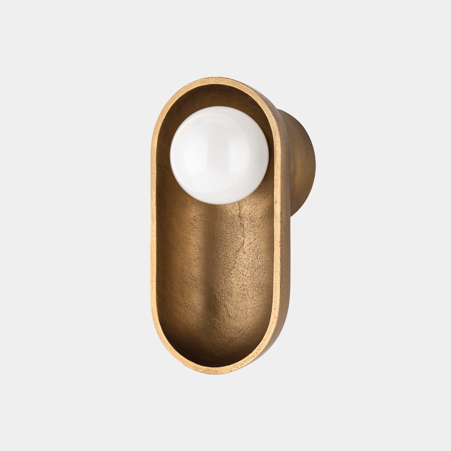 Nathan is a fresh, understated take on the nautical theme. A clear etched glass globe fills the thick pill-shaped Aged Brass metal cavity with a warm glow.