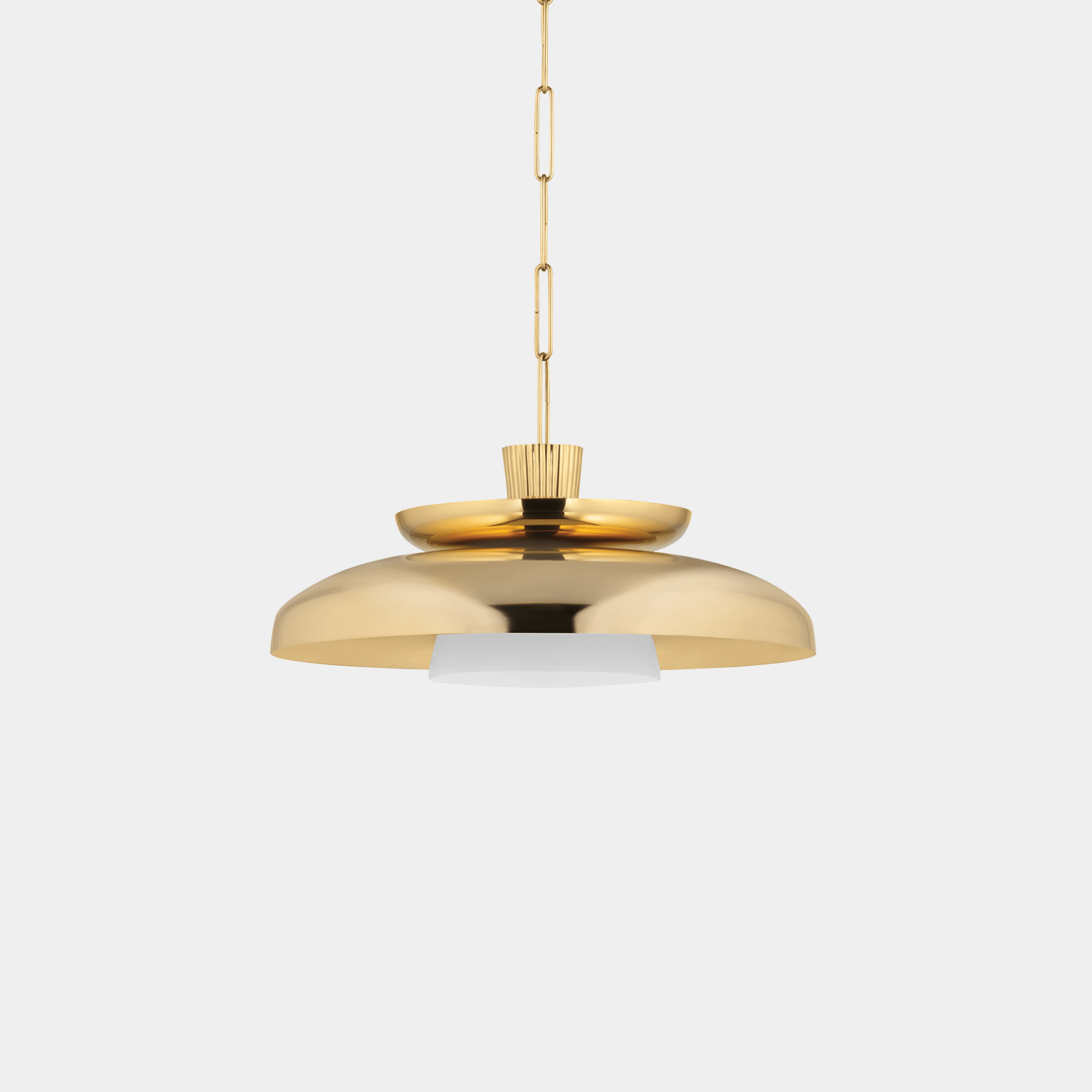 The architectural form and distinctive detailing of Ravenna make this shapely pendant a timeless treasure. Featuring alternating shallow bowl layers, the artistic stacked design culminates in a shiny opal glass shade nestled beneath a metal canopy. A ribbed cap adds an organic touch, while the allover Vintage Brass finish complements the glamorous silhouette.