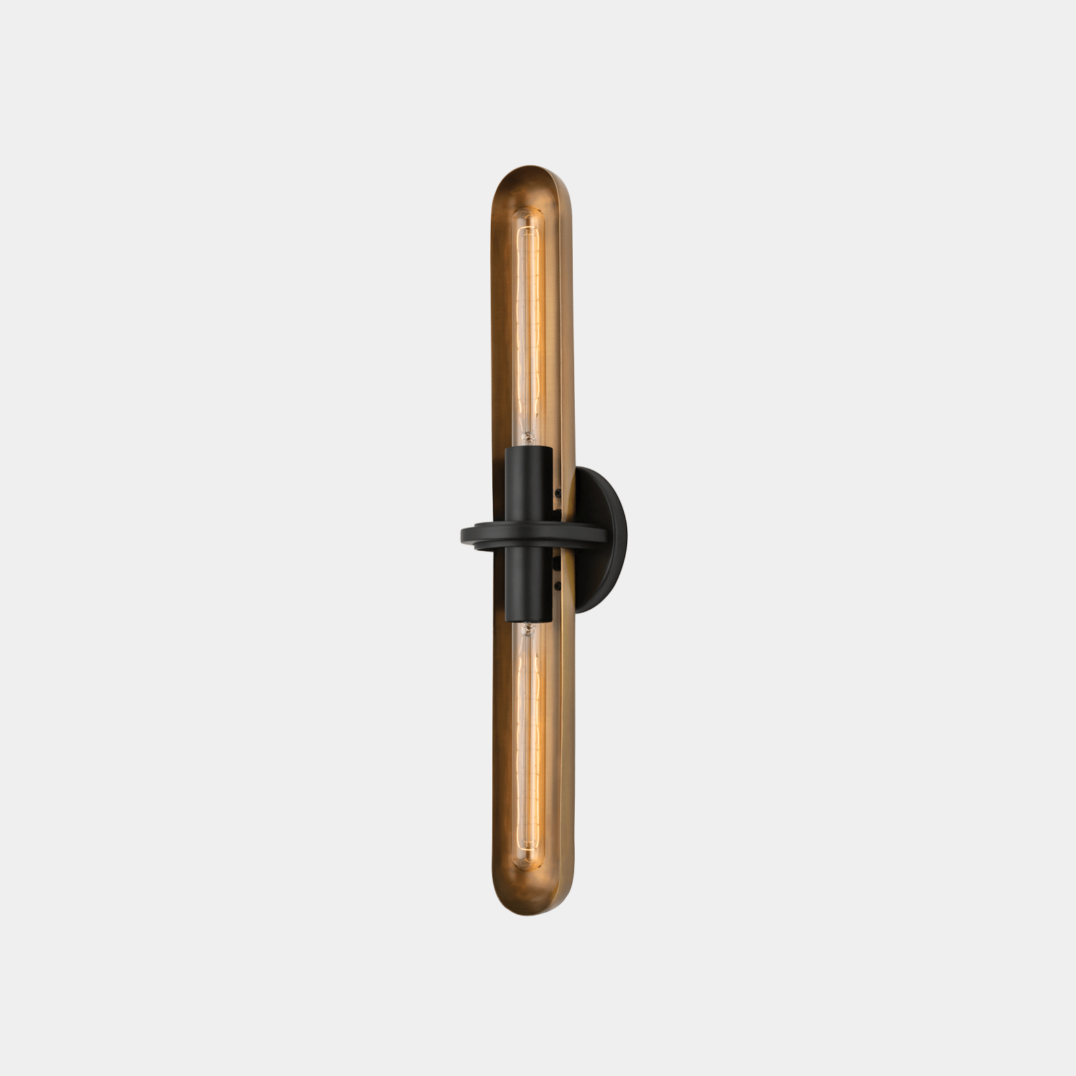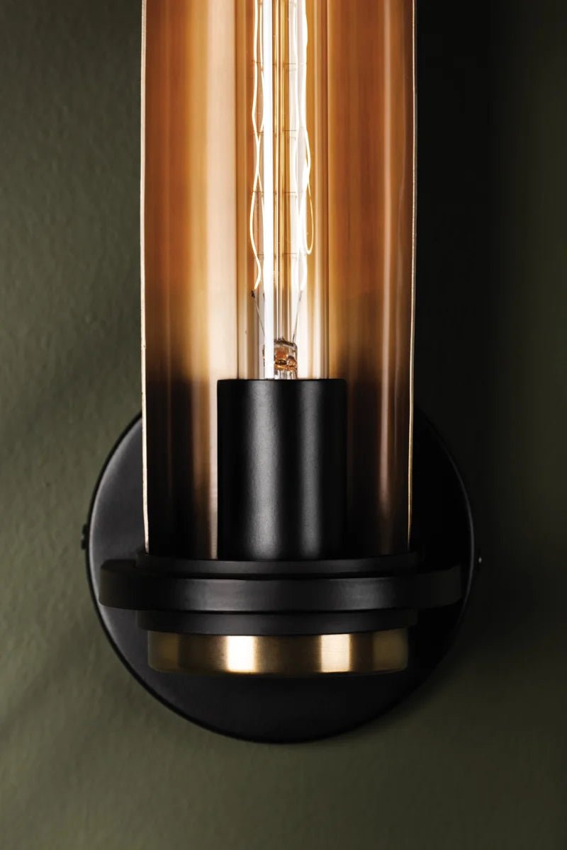 Add drama to the wall with this sconce inspired by early theatrical lights. A cylindrical glass shade is plated in Patina Brass and Soft Black creating a smoky, vintage vibe. Light from the bulb inside casts a warm glow that reflects softly off the wall. The two-light option can be mounted horizontally or vertically.