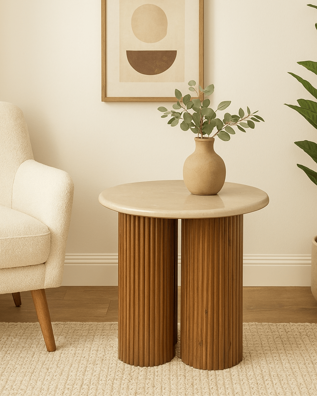 This is our Basilia Travertine Top Side Table, Â featuring a seamless mango wood body with a elegant travertine top easy to style.
