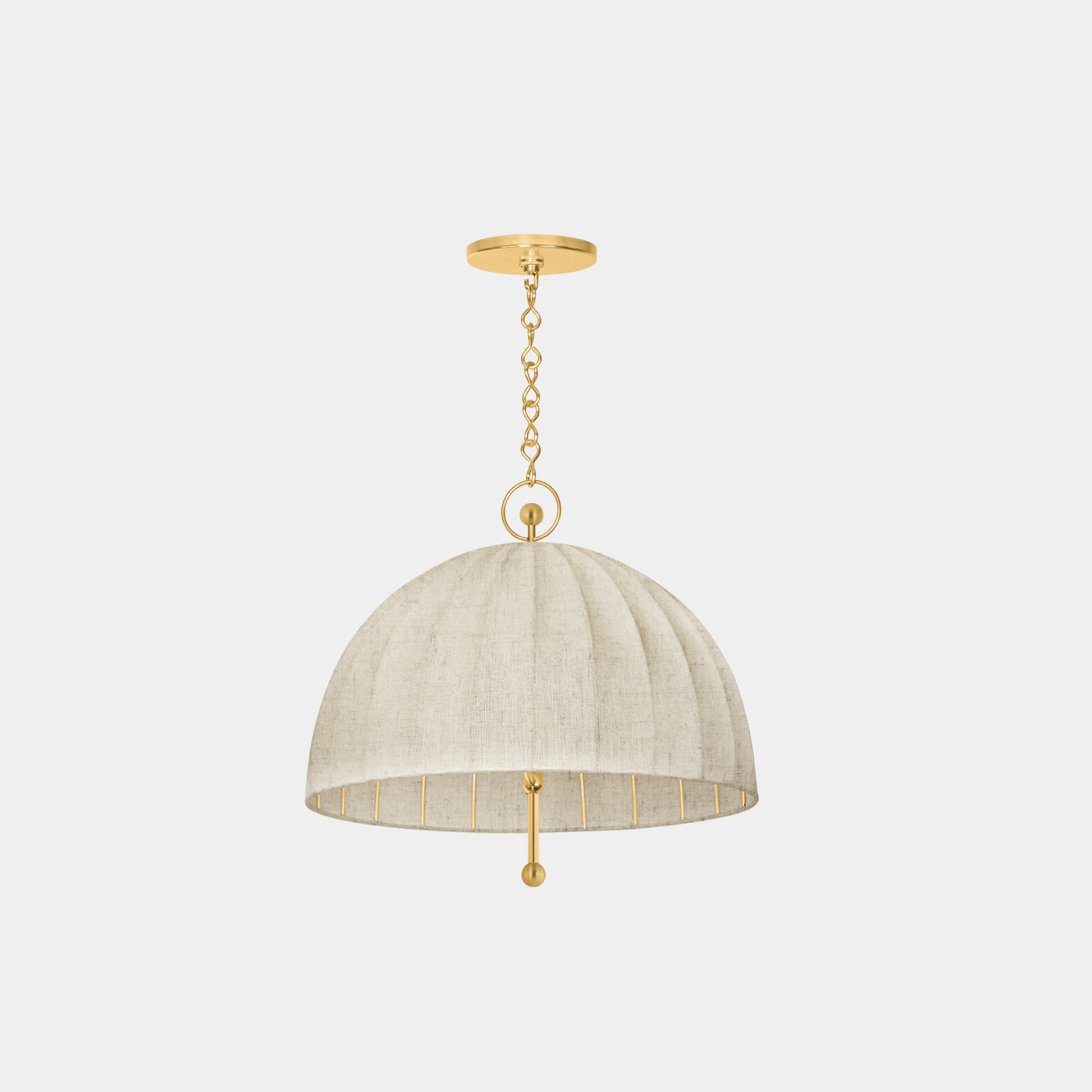 Textural and bold yet inherently soft, the Palmetto family plays with materiality and scale. The voluminous, parasol-like shade is woven from natural silk with sculptural pleats that become more prominent when illuminated. Available as a pendant in two sizes and a lantern, Palmetto’s oversized silhouette adds quiet drama to dining spaces, larger bathroom vanities, and cozy banquettes. The floor lamp brings the same depth to lounge spaces, reading nooks, and dens. The Aged Brass metalwork complements the vintage-inspired nature of the design.