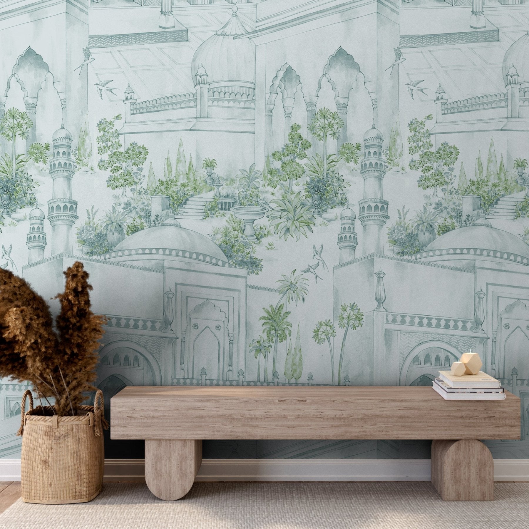 A watercolor mural blooming with flowers, gardens, and Agra-inspired archways. Hand-illustrated details bring a touch of heritage and freshness to any space.